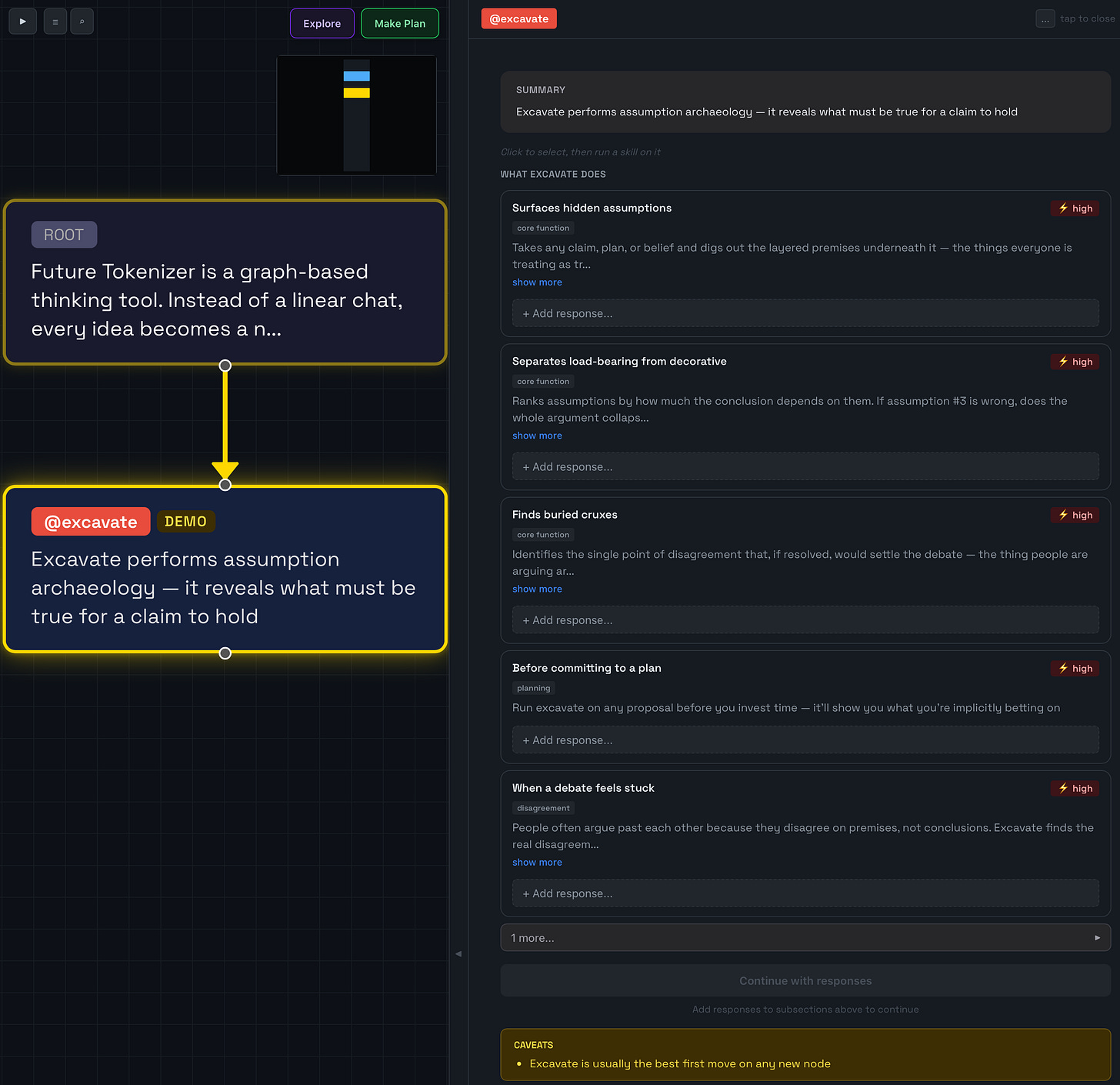 You can then run one of the Future Tokens skills on it. Excavate is a good first choice. It surfaces the assumptions that underlie any statement.