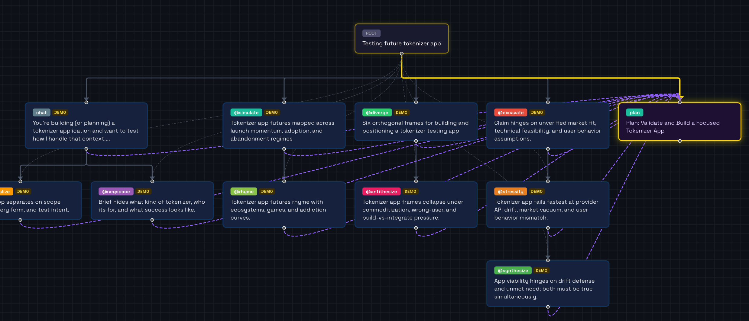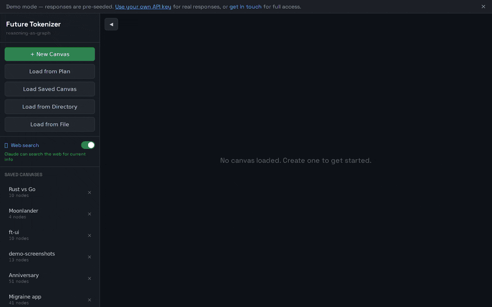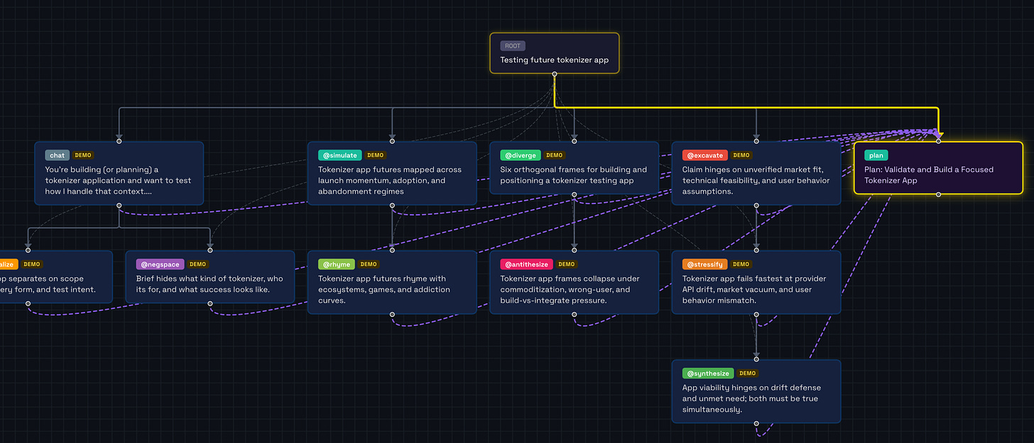 Thinking has structure: moves, operations, branches, types, tensions, dead ends, convergences. Most interfaces squeeze your thinking into a single textbox that receives a single response. Future Tokenizer expands your response surface, so you can see how many options you actually have.