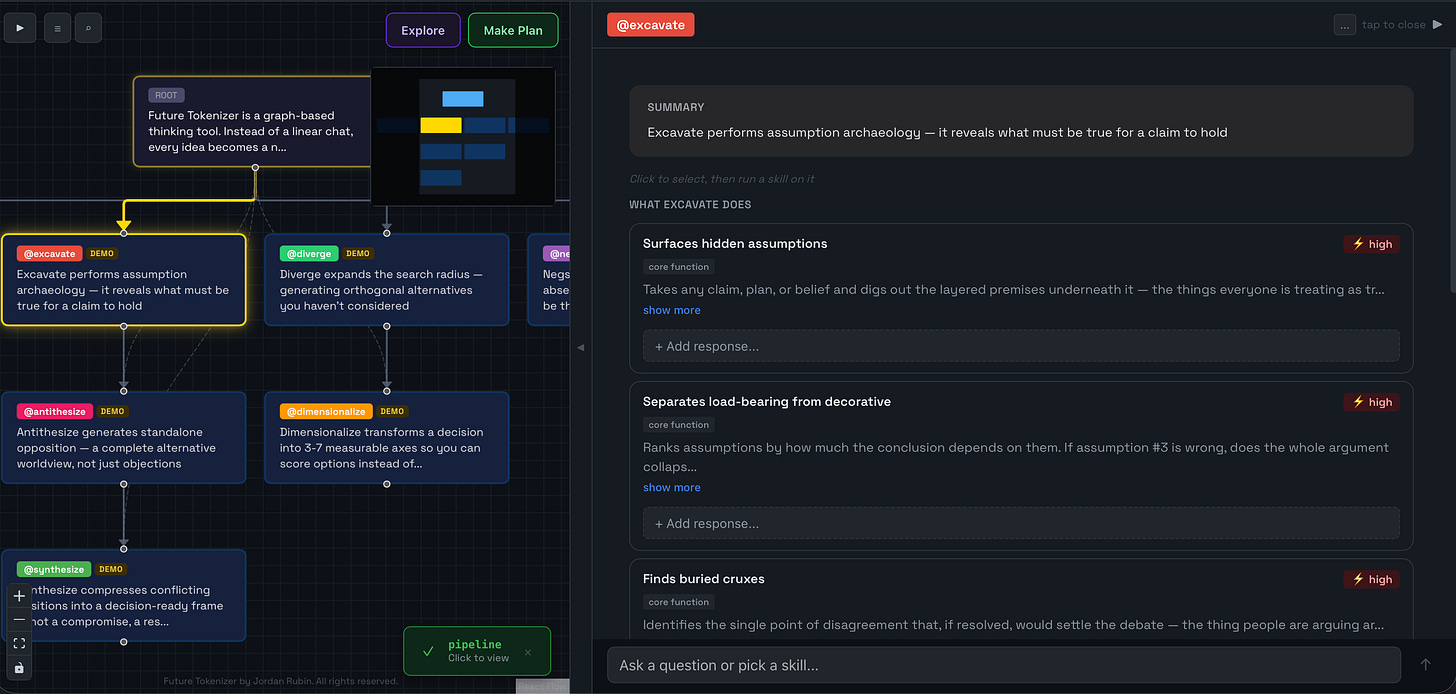 Skills are graph operations. The output is a plan you can hand to an agent. Human-curated AI thinking goes in, good plan comes out. Future Tokenizer is an IDE for human-AI collaborative thinking.