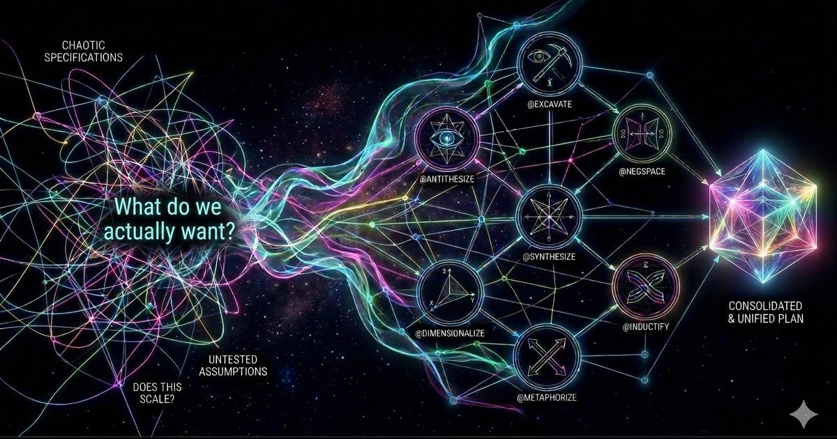 Each branch spawns its own second layer. Negspace finds what the chat node missed. Rhyme maps structural parallels to other domains, focusing on the Simulate node’s output. Antithesize builds the case against pursuing the ideas generated in the Diverge node. Stressify hunts for weak points in the assumptions Excavate surfaced.